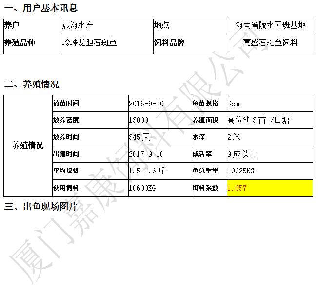 客戶反映自己有五口成魚塘抓了10萬斤魚,共計用了53噸嘉盛石斑魚飼料,魚價都在31左右,真正賺到了錢。嘉盛石斑魚料的養殖效果非常不錯,體型佳、體色漂亮、體質健康、長速快、餌料系數低、飼料質量穩定可靠,剩下的20幾口塘魚長勢也很好,一直用嘉盛石斑魚飼料。 用事實說話,為嘉康飼料點贊!